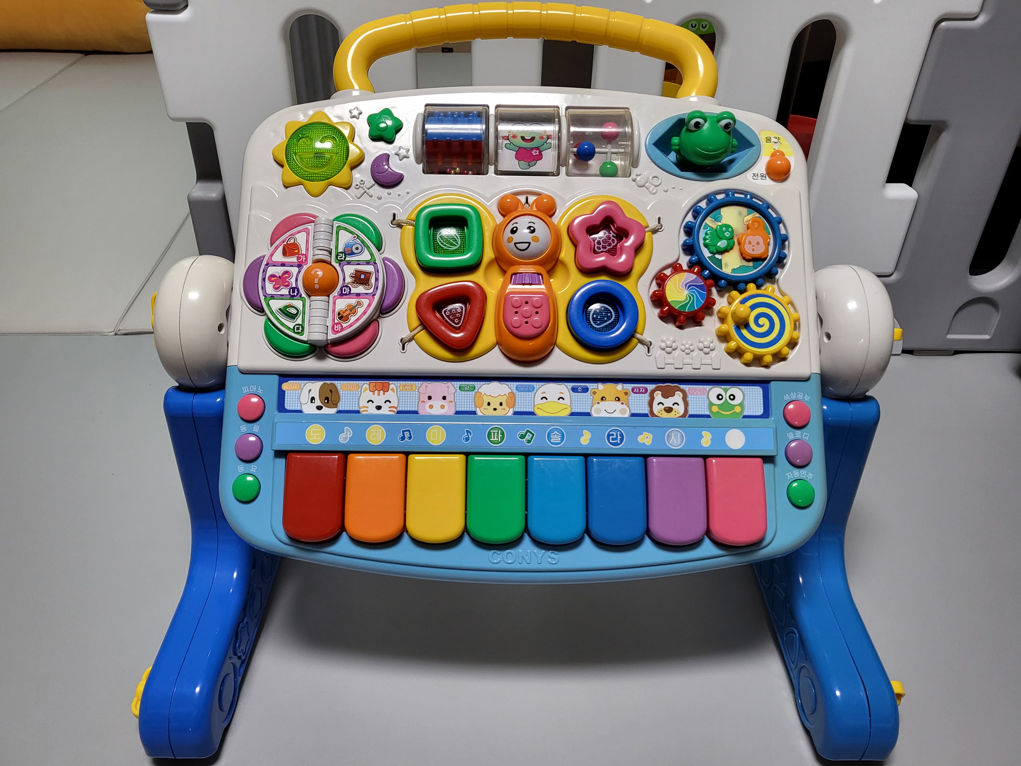 | 양 옆에 테이블 높이와 각도를 조절할 수 있는 기능이 있구요, 신상아때는 체육관 모드로 누워서 아이가 이것저것 만지고 눌러볼 수 있어요. 나비 날개 부분에 네모, 세모, 동그라미, 별 모양이 빠져서 주렁주렁 매달려서 모빌처럼 사용이 되더라고요. 아이가 앉기 시작하면 테이블 모드로 앉아서 놀 수 있고, 걸음마를 시작할 때 쯤에는 위쪽 손잡이를 잡고 서는 연습을 하더라고요. |