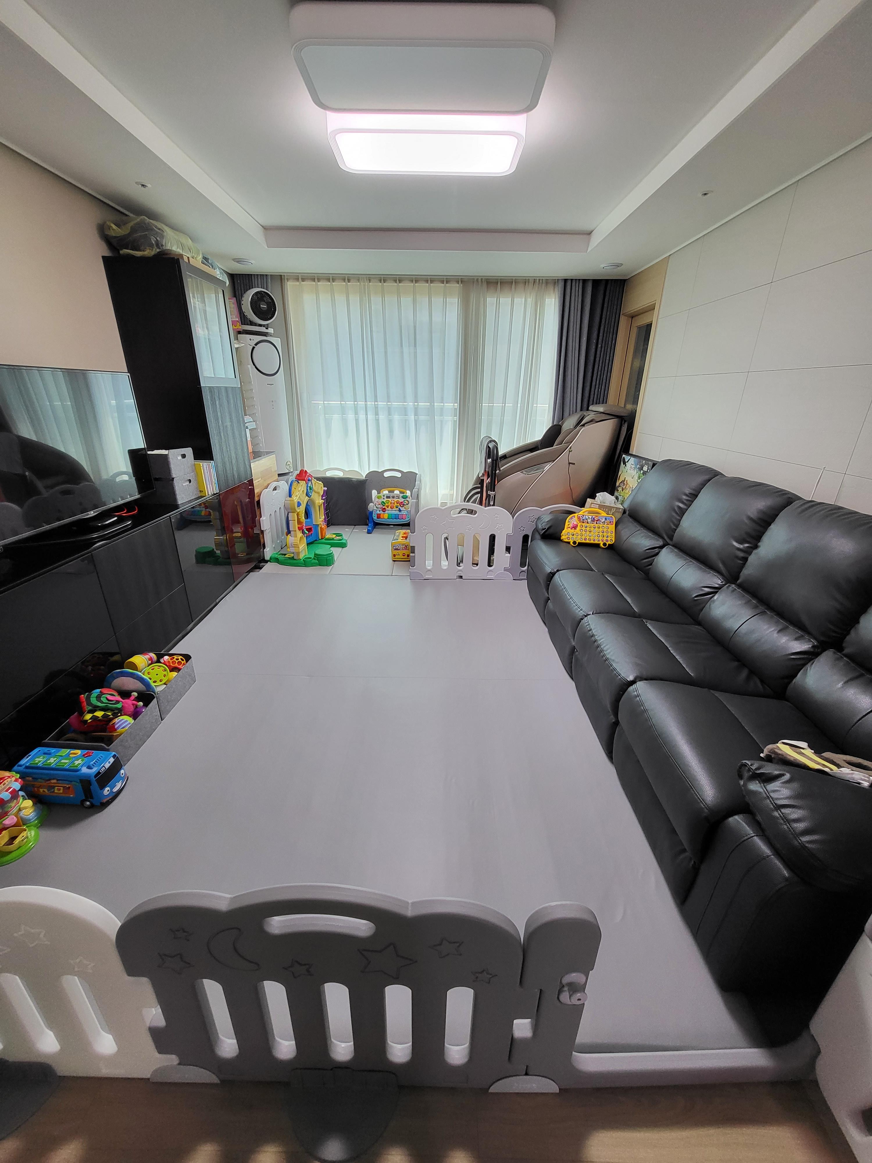 저는 아이가 태어나기 직전에 거실에 알집 더블제로매트를 미리 깔았고, 아이가 기어다니기 시작할 무렵에 카라즈 베이비룸을 설치해서 거실 구성을 했어요.