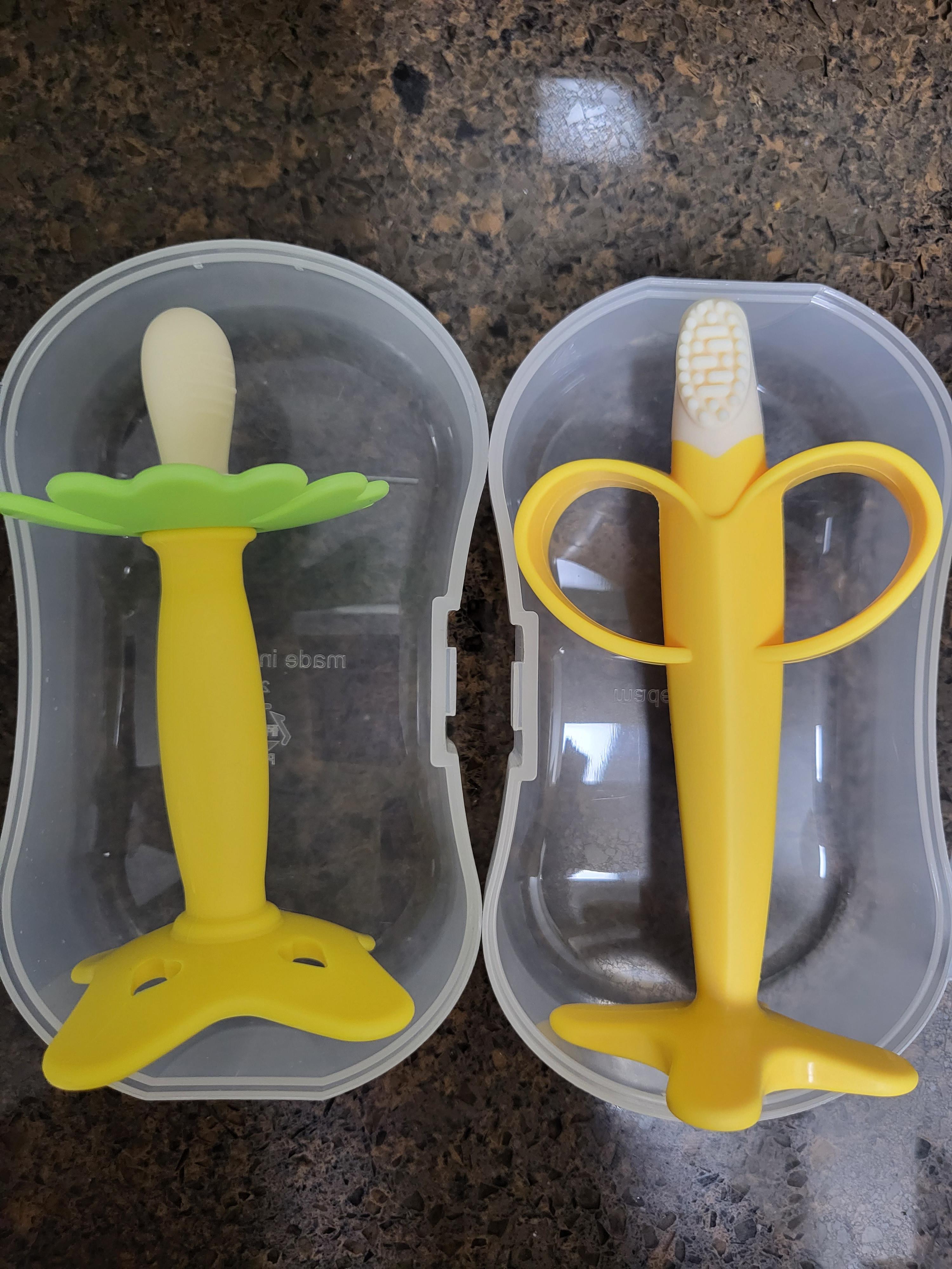 그래서 바나나 모양 치발기를 사용해 보았는데요, 아래 보시는 것처럼 두가지 모양이 있어요. 두개다 일단 입에 넣어도 목젖까지 들어갈 수 있는 모양은 없습니다. (왼쪽)꽃무늬나 (오른쪽)손잡이에 걸리거든요.