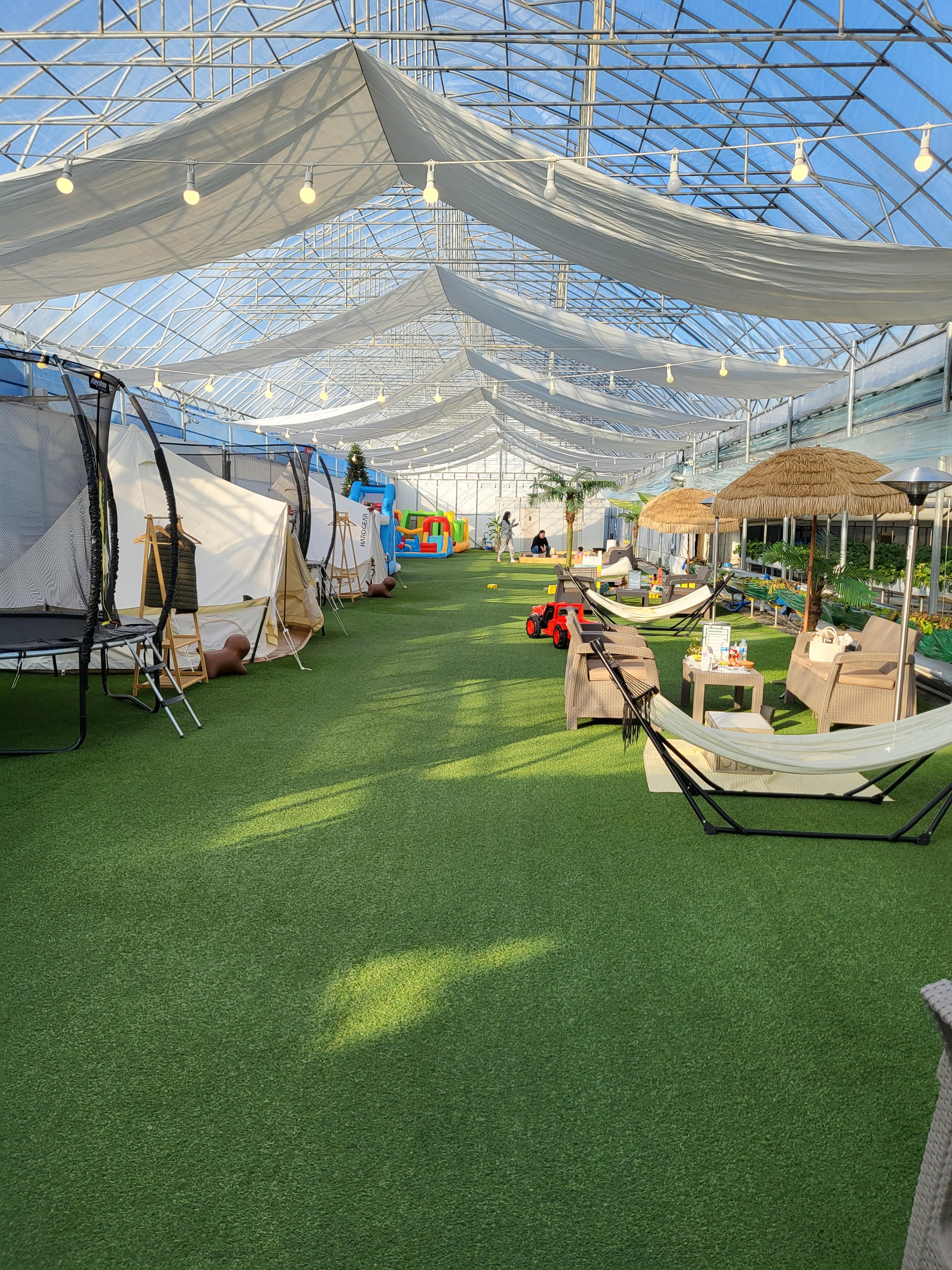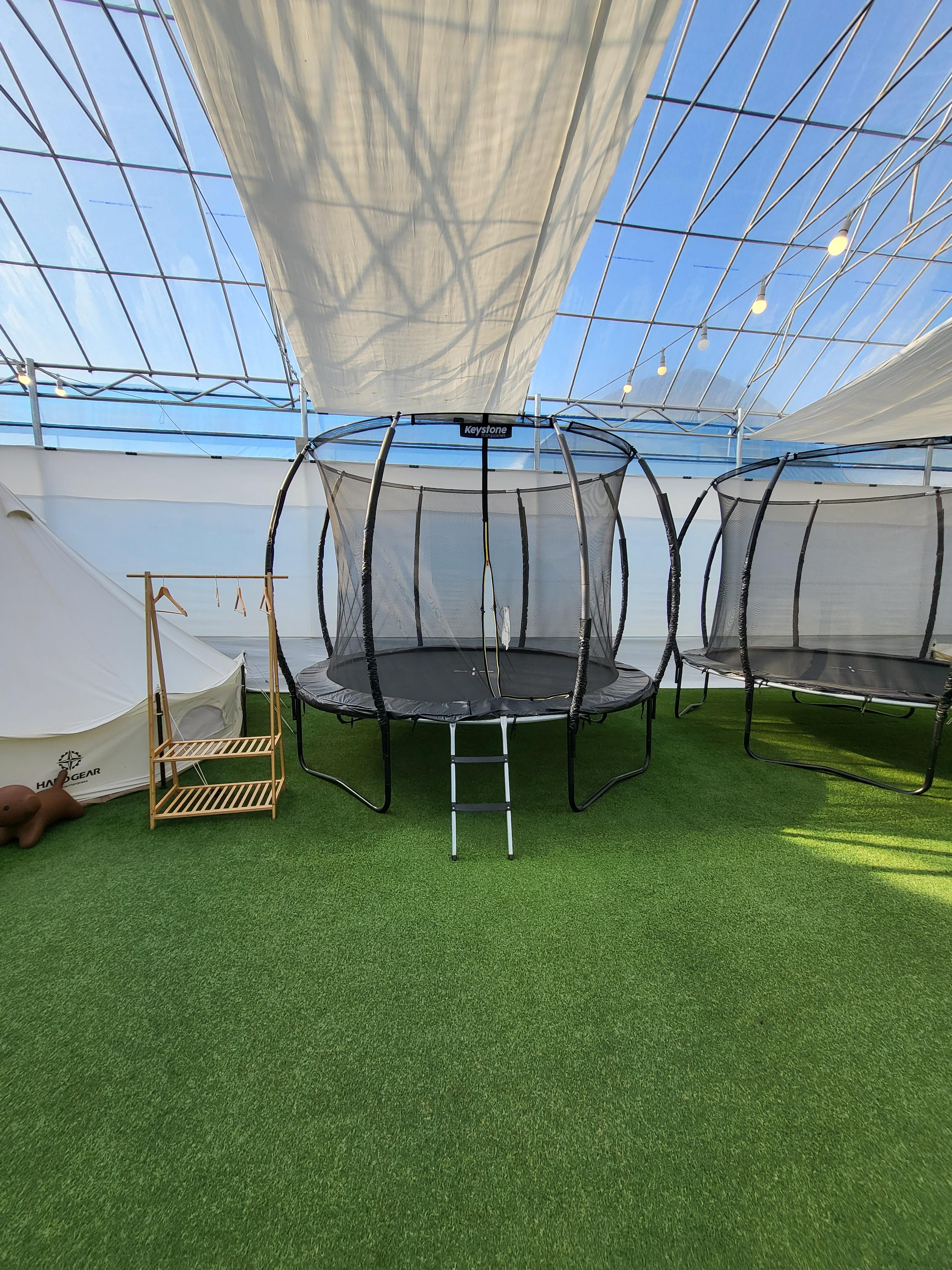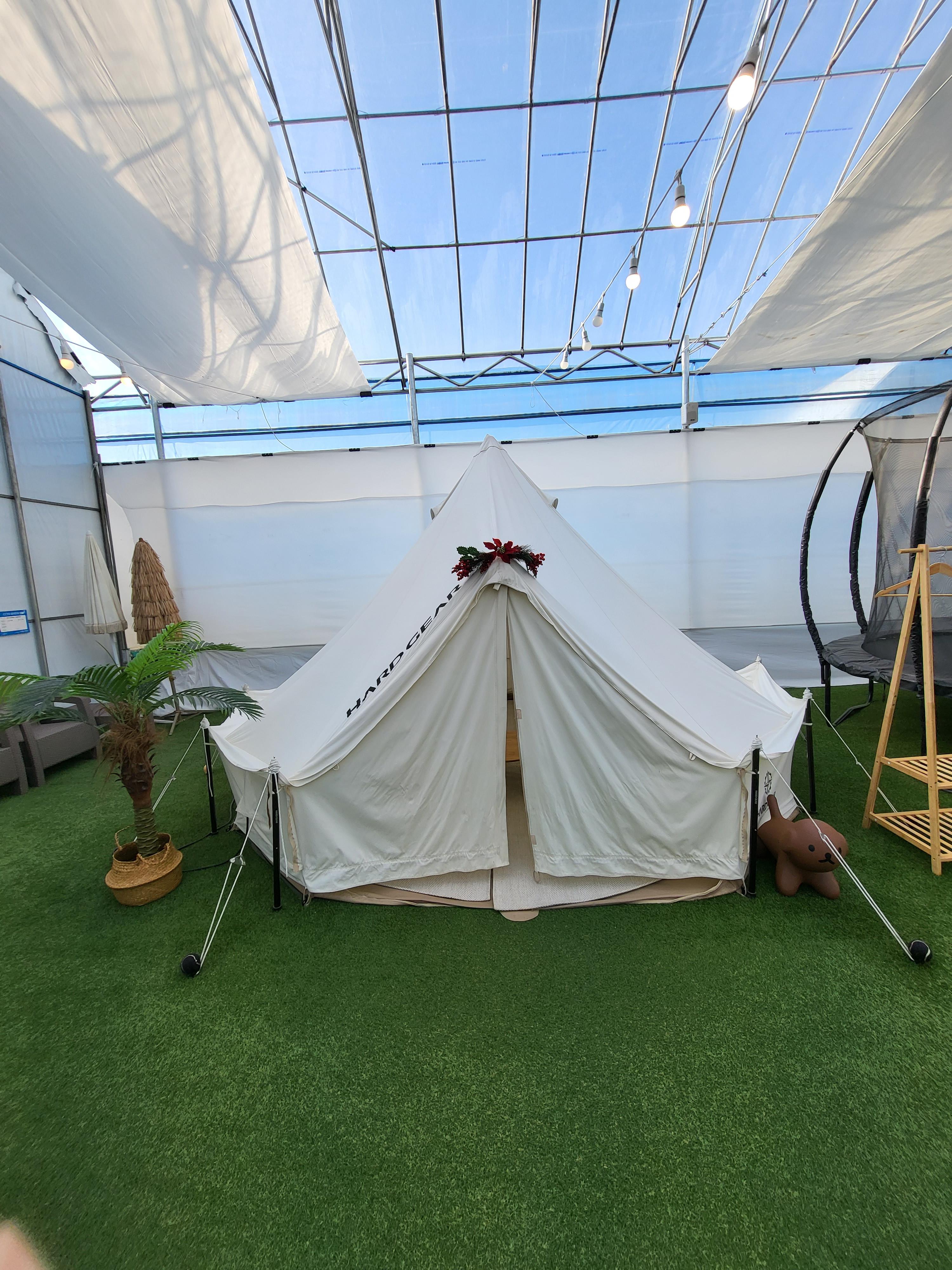 개인존은 해먹, 바닥 인조 잔디에 깔린 귀여운 천돗자리, 테이블&의자, 트램폴린, 인디안 텐트까지 전부 예약시간 안에는