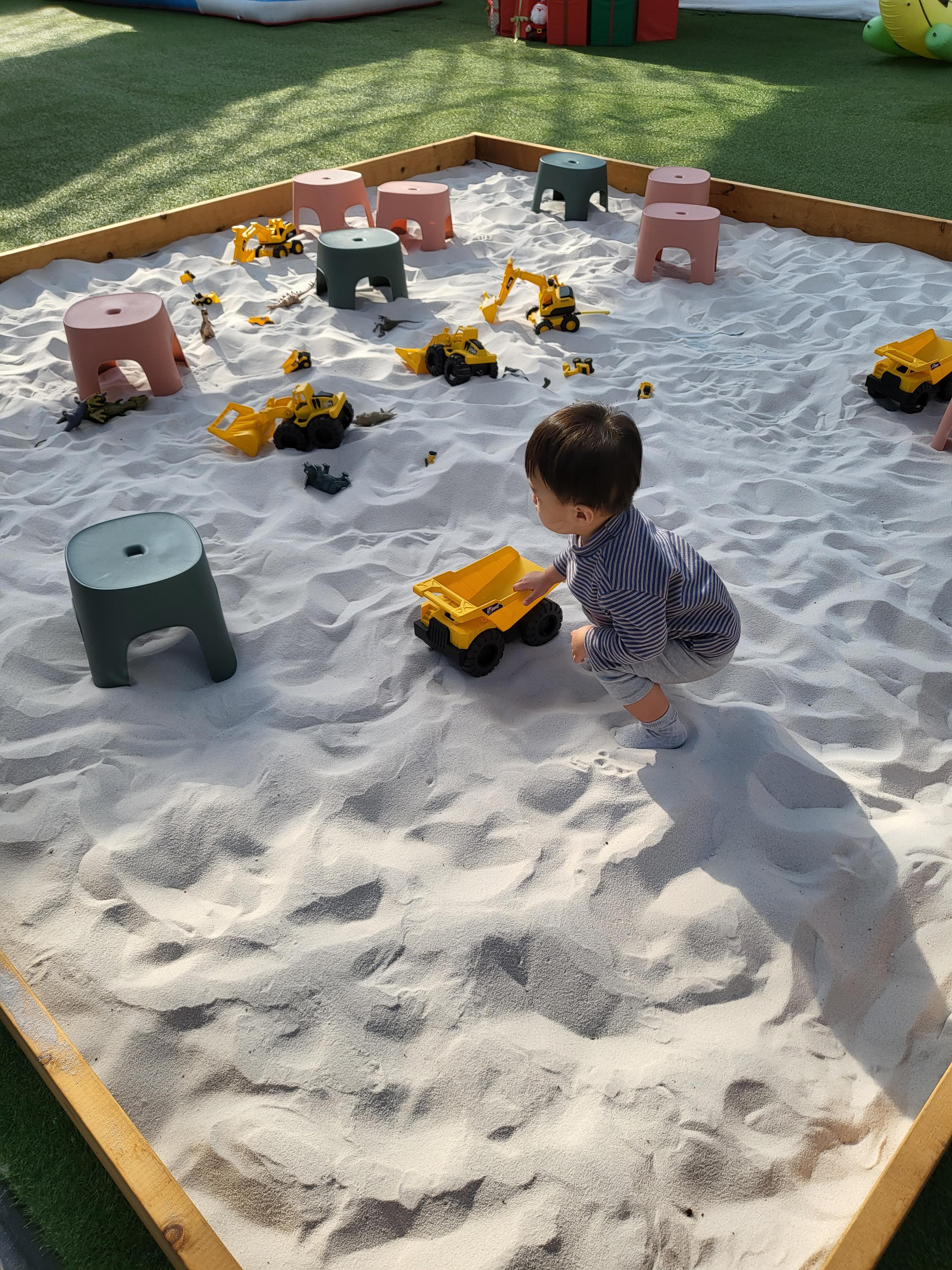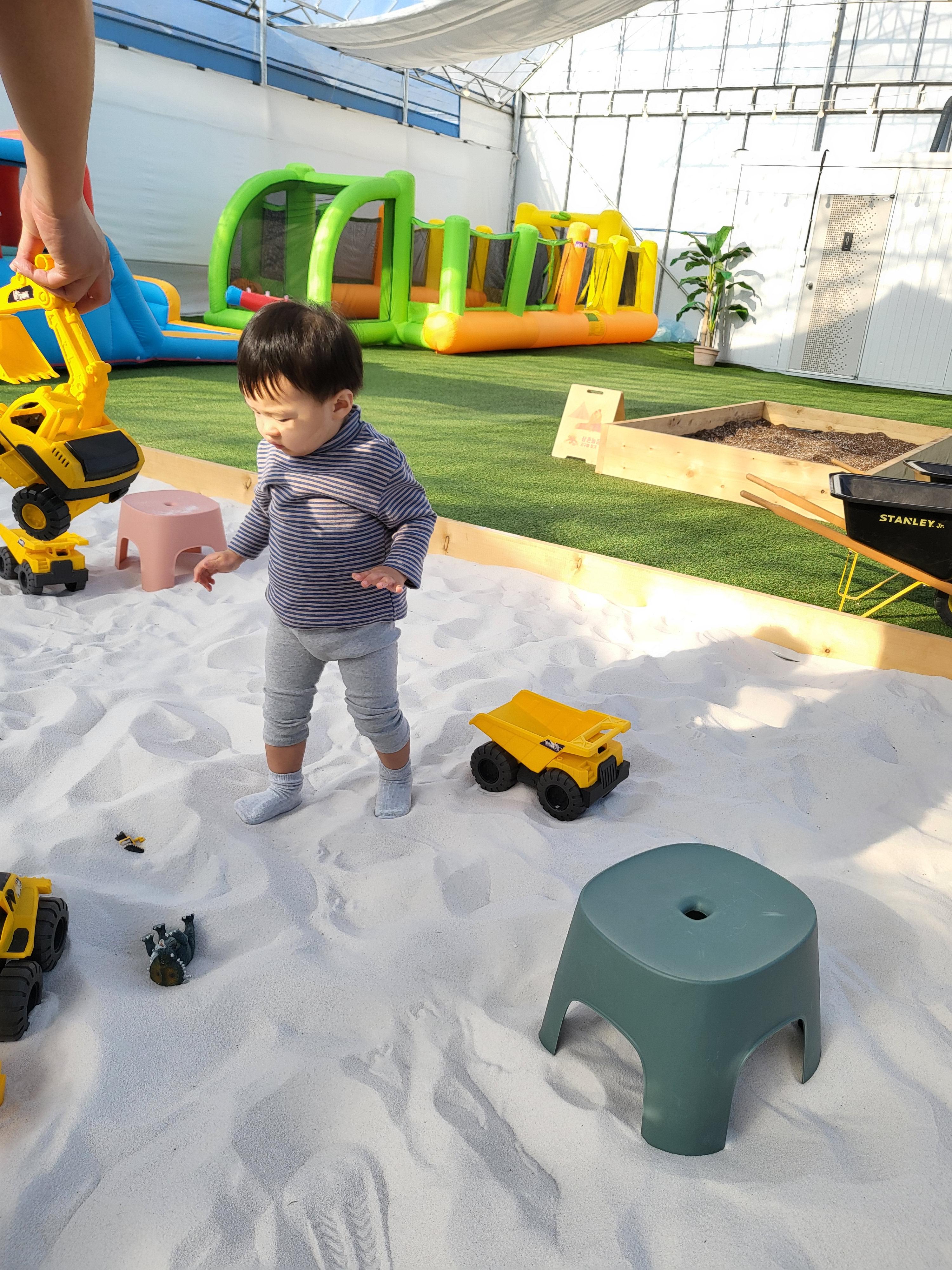 아이가 탈수 있는 작은 트렉터? 비슷한 전동차도 있었고, 모래 놀이와 블럭 놀이,