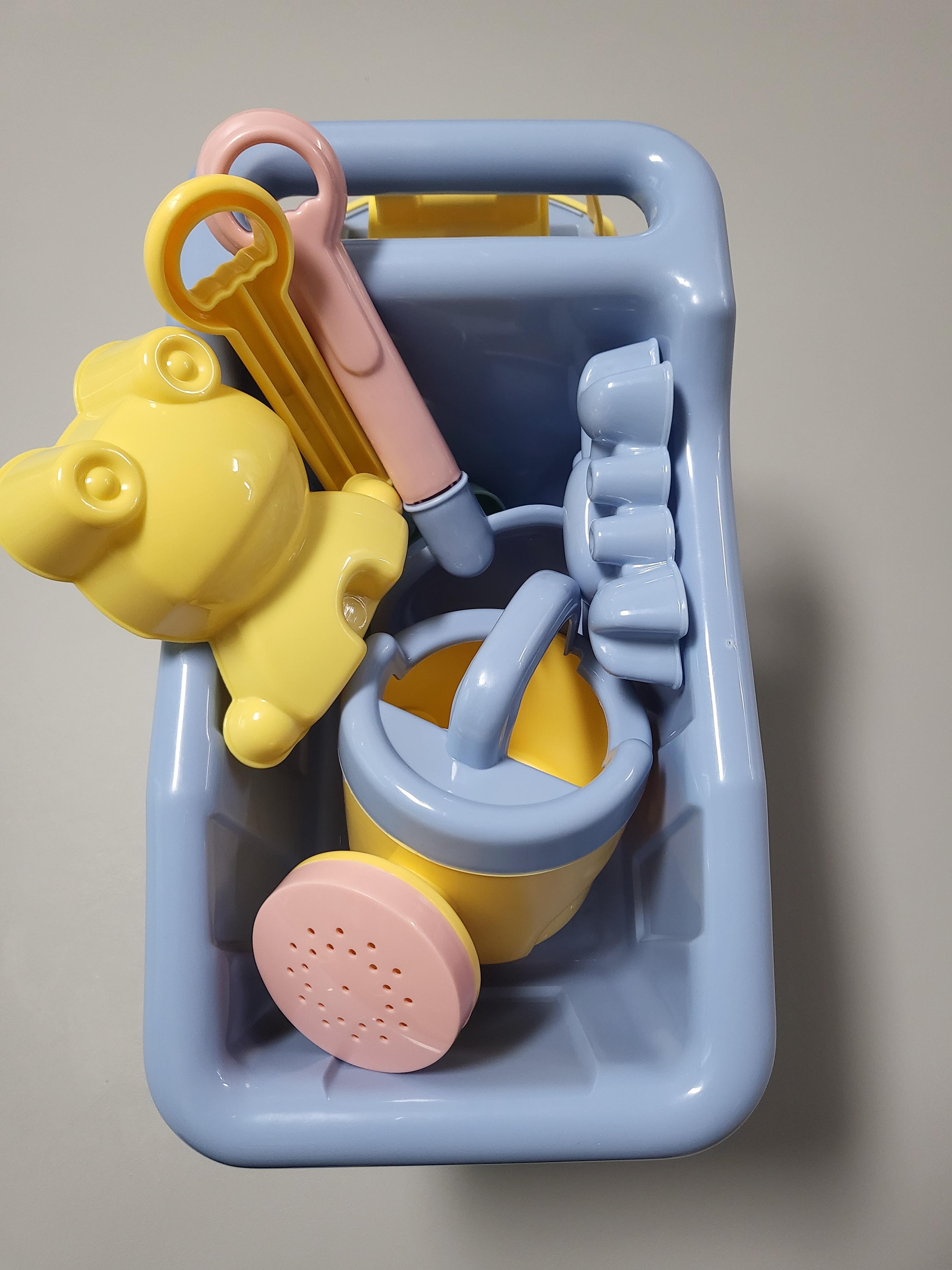 모래를 담아 만들수 있는 게와 개구리 모양의 틀과, 삽, 물조리개와 덤프트럭이 한세트 구성으로 되어있어요.