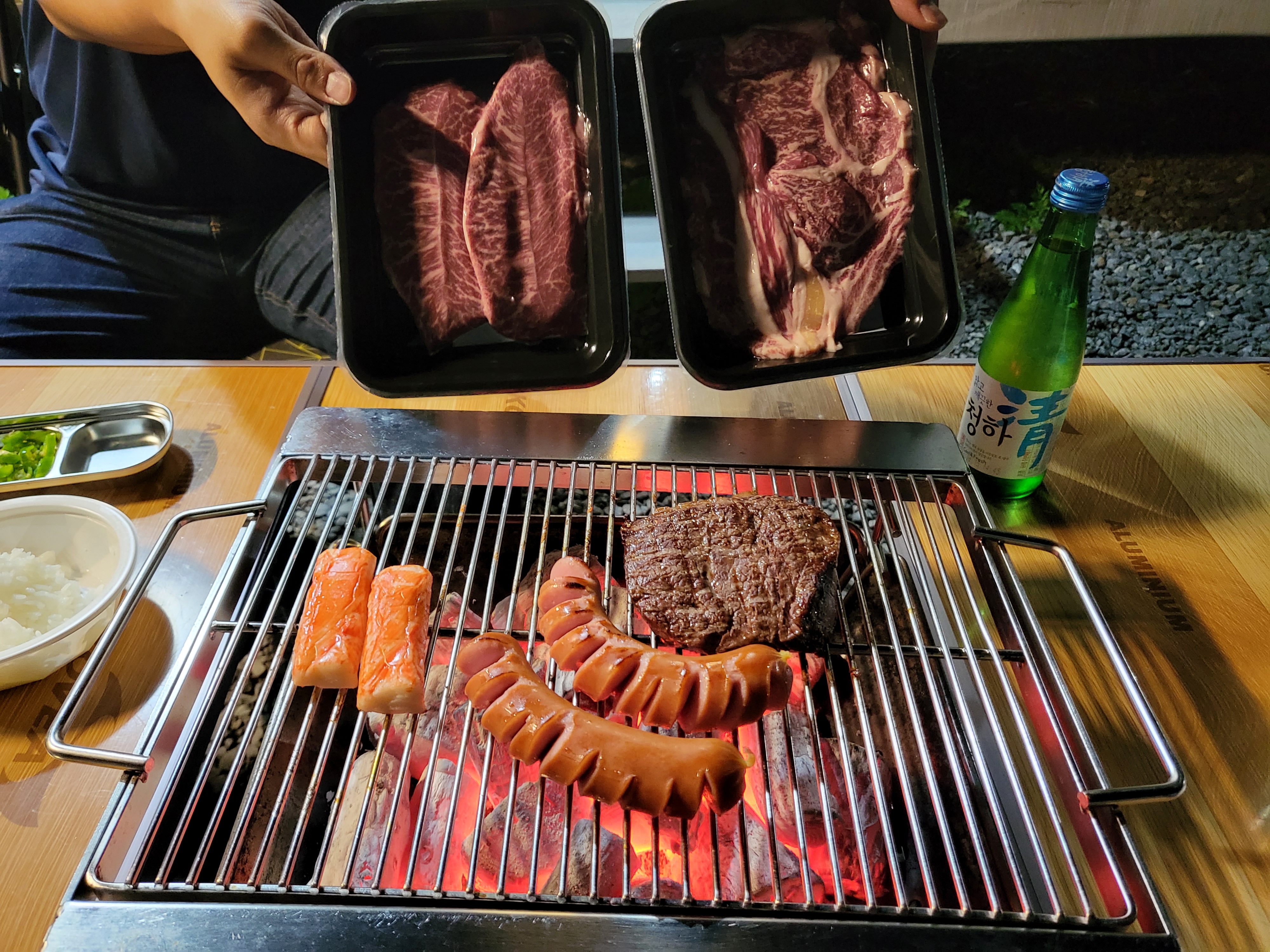 저녁으로 진짜 오랜만에 숯불에 구운 고기와 함께 간단하게 술 한잔 하고 불멍까지 했어요.